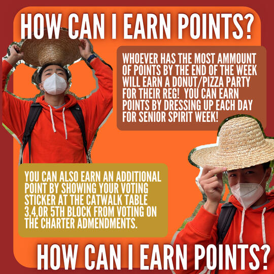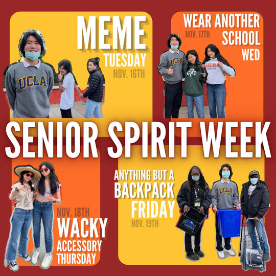 Hi Seniors! We know the last week has been a tough one, so our board wanted to end this last week before Thanksgiving break off with something lighthearted— SENIOR SPIRIT WEEK!Like the spirit weeks we have before fall/spring rallies, but just for seniors, and so much fun!!!! From tomorrow to Friday, we have some fun and easy dress up themes. Find us every day on the catwalk everyday blocks 3,4,5 for free candy and to earn a point for you reg if you dress up! The reg with the most points at the end of the week will win a donut or pizza party!Additionally, voting for LSA charter amendments is occurring tomorrow and Wednesday, so if you show us you voting sticker, you can earn an extra point as well!