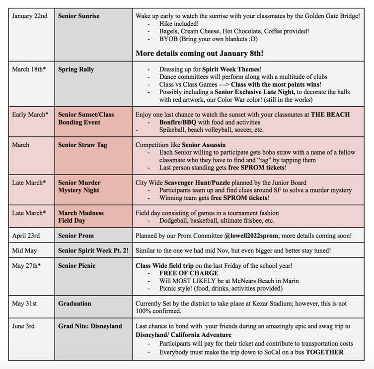 LSA, or Lowell Student Association is the governing body of Lowell High School. Specifically, the main role of the LSA 2022 Senior Class Board is to provide support for you all!This includes academic support throughout the college application process through panels and workshops, as well as support through fun events! Our board oversees and/or carries out all class related events, including Senior Prom, Senior Sunset, Senior Picnic, Grad Nite, and more! On top of this, the LSA 2022 board oversees all class finances, and acts as a bridge between students and the administration. We are advocates for you all, so do not hesitate to use us as a resource if you have any questions or concerns!Learn more about us, our officers, and what we do on the official LSA Website: